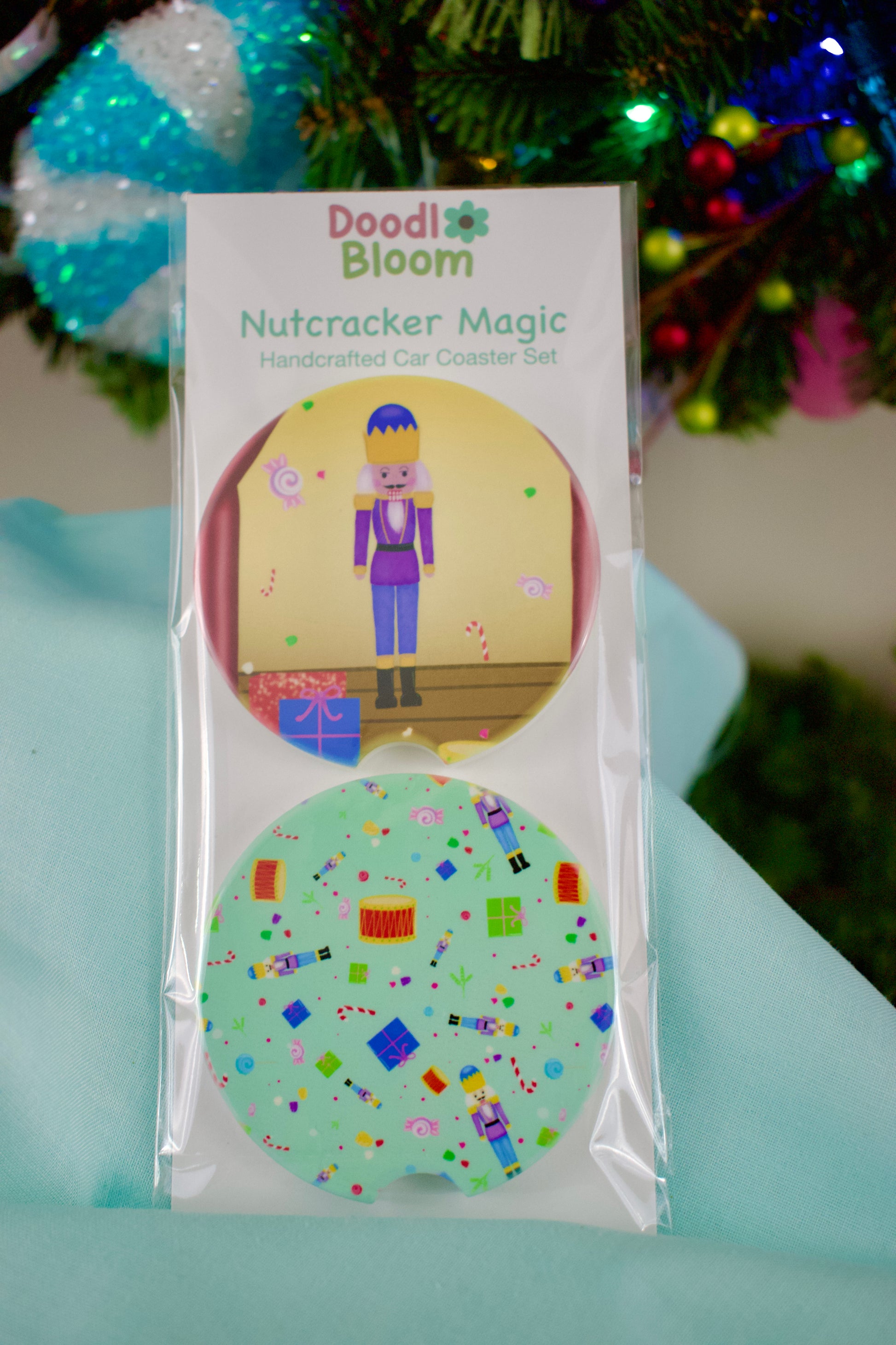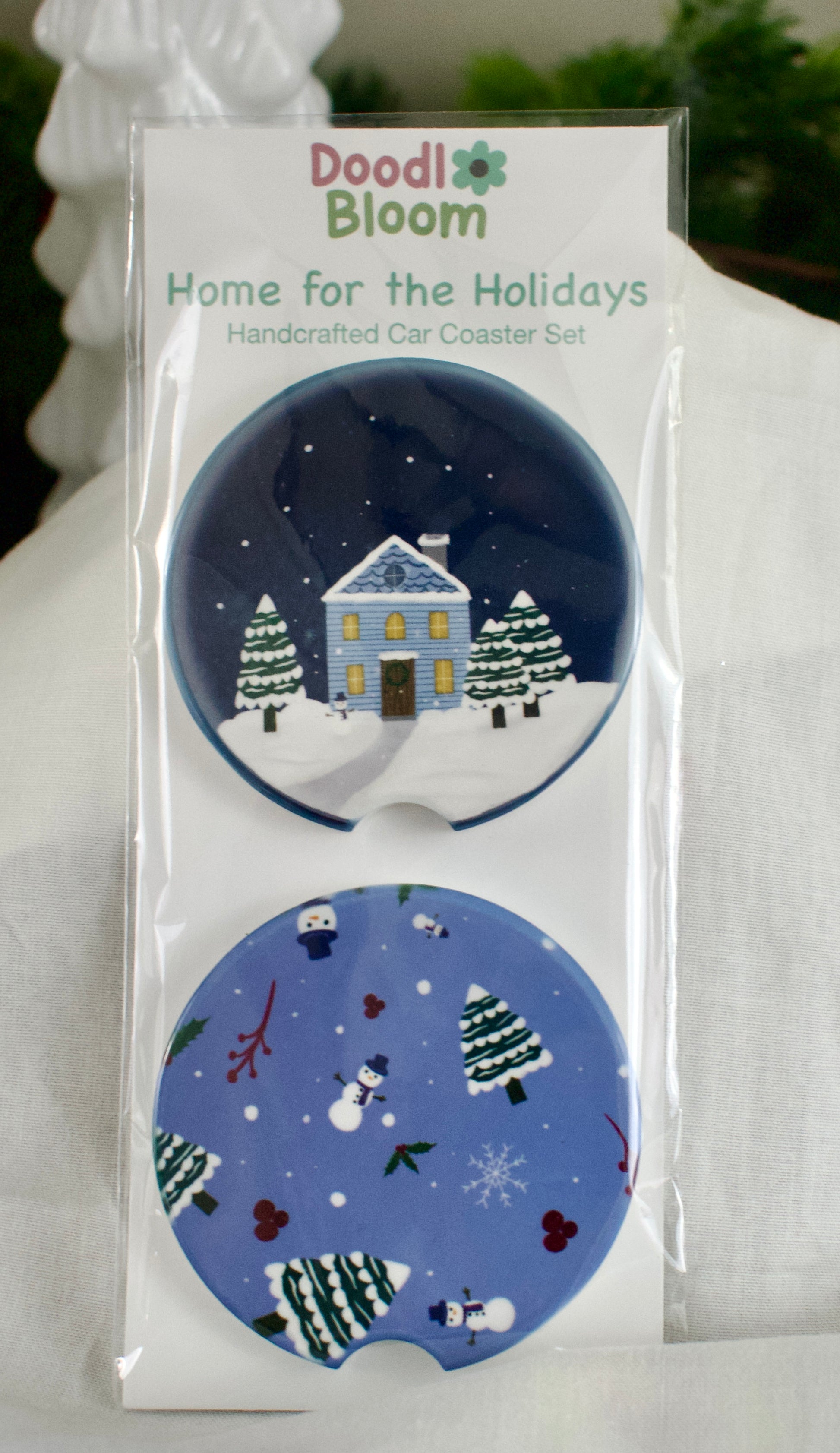 Each Doodl Bloom ceramic car coaster features original holiday artwork permanently pressed onto smooth, absorbent ceramic. Designed to fit most standard car cup holders, these coasters protect your surfaces while adding a festive touch of color and personality.