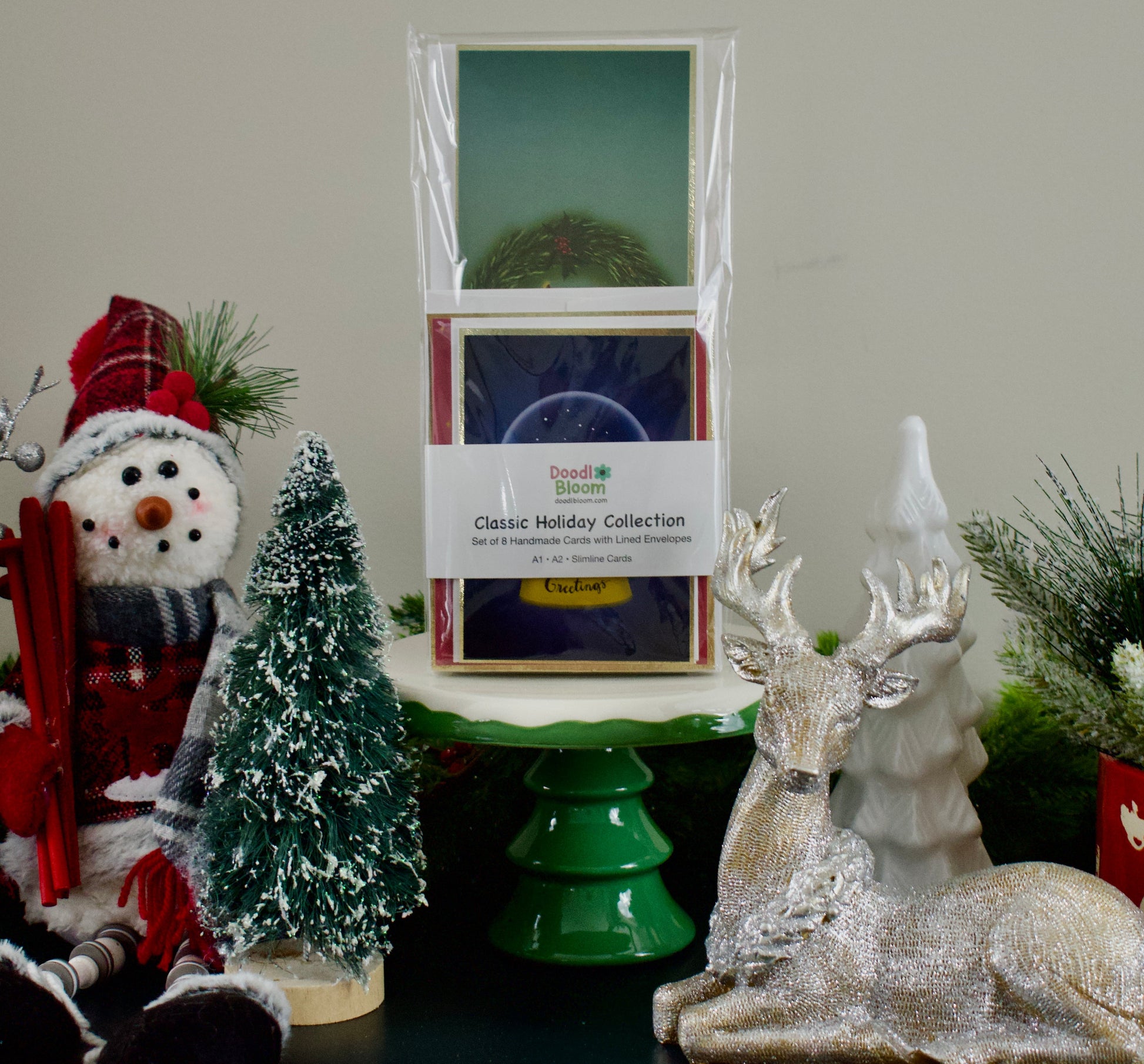 Each Doodl Bloom holiday card bundle features Doodl Bloom original artwork — a mix of classic wreaths, cozy winter scenes, and whimsical nutcracker designs — printed on smooth, heavyweight cardstock with matching lined envelopes.